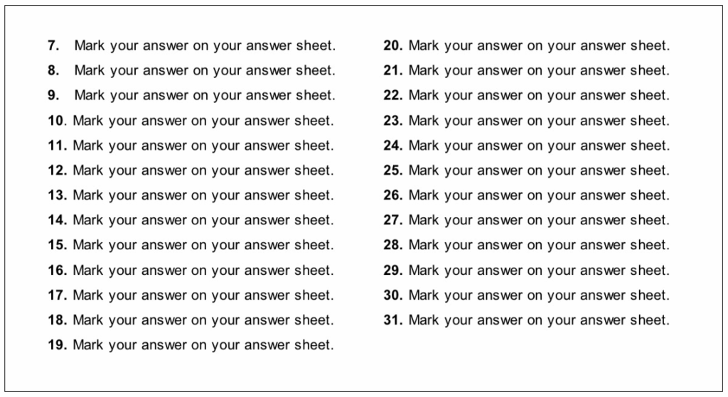 さて、Part 1の写真描写問題で髪を金色に染めた後(連載第2回参照)、息つく間もなくやってくるPart 2応答問題25問。おや?問題冊子を見ると、問題番号7から31まで同じ文が書いてあります。